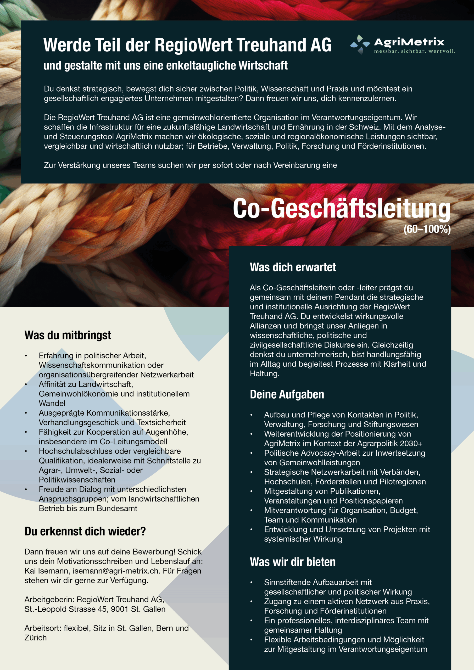 Die RegioWert Treuhand AG ist kein gewöhnliches Unternehmen. Sie ist ein Bauwerk im Werden, eine Infrastruktur für eine Landwirtschaft und Ernährungswirtschaft, die Verantwortung übernimmt und ihre Leistungen sichtbar macht. Damit dieses Vorhaben weiter wachsen kann, wollen wir uns von einer Persönlichkeit finden lassen, die Lust hat, mitzusteuern.