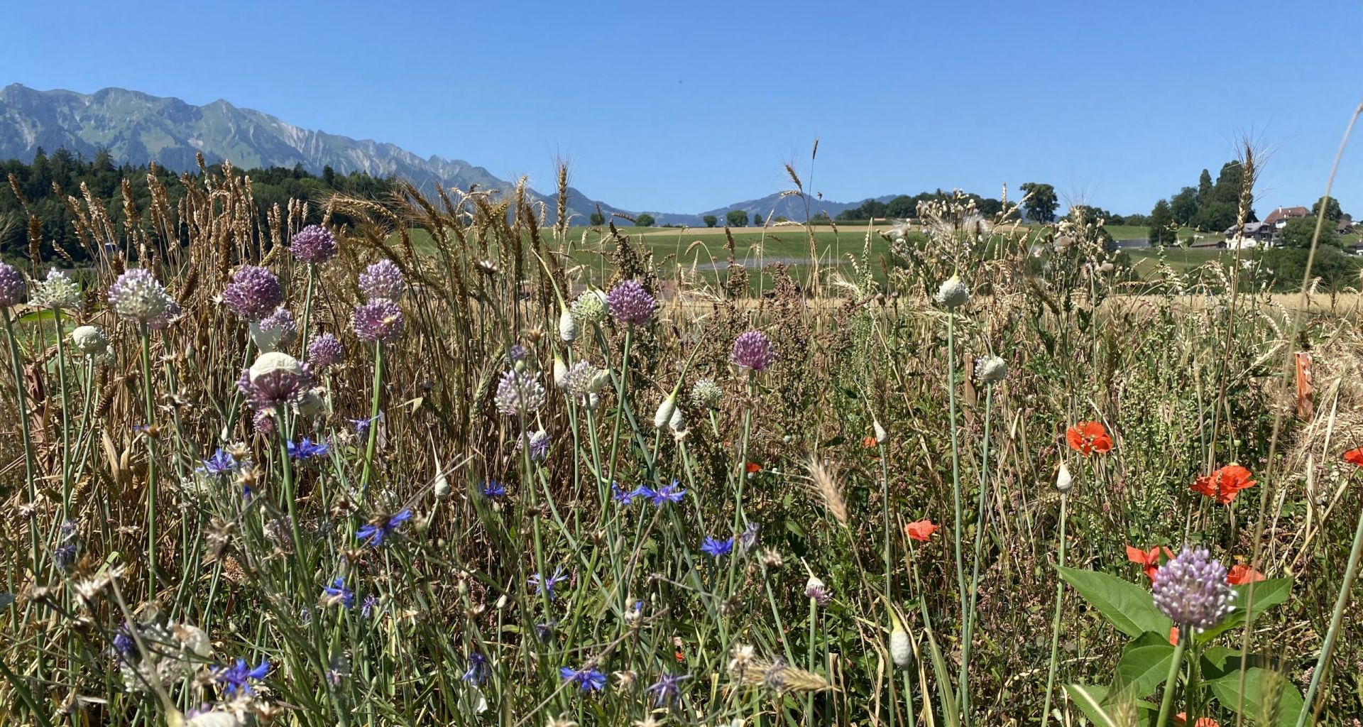 Zwischen den Halmen wachsen Kräuter und Blumen.