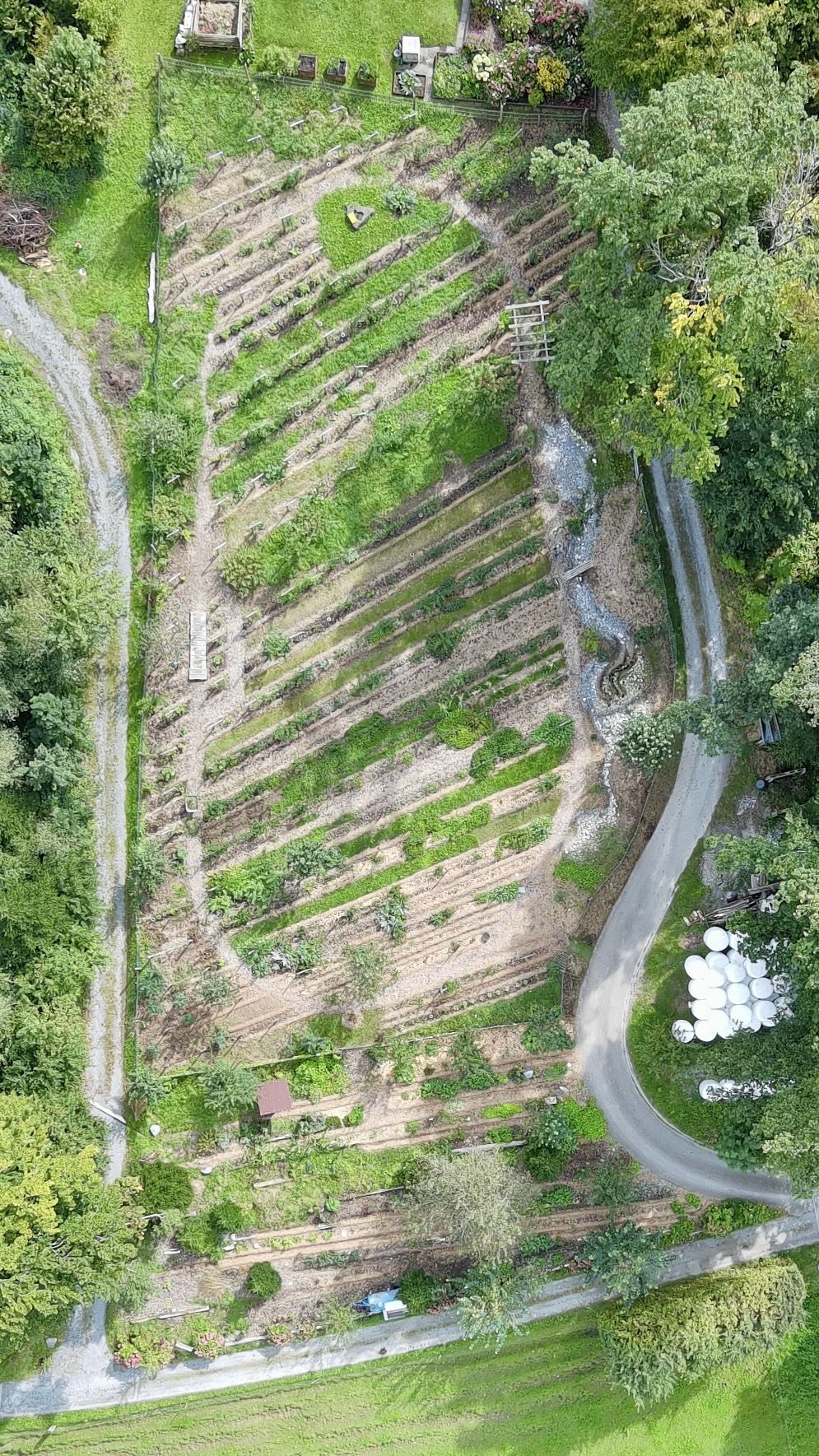 Der Agroforst im Herzen des Betriebs folgt den Prinzipien der Permakultur. Auf 60 Aren wachsen Obstbäume, Beeren, Heilpflanzen, Reben und extensive Wiesen in einem sorgfältig gestalteten Zusammenspiel. Durch Wasserretention, Mikroklimazonen, Windschutzsysteme und mehrjährige Kulturen entsteht ein System, das mit wenig externem Input auskommt und langfristig stabile Erträge ermöglicht.