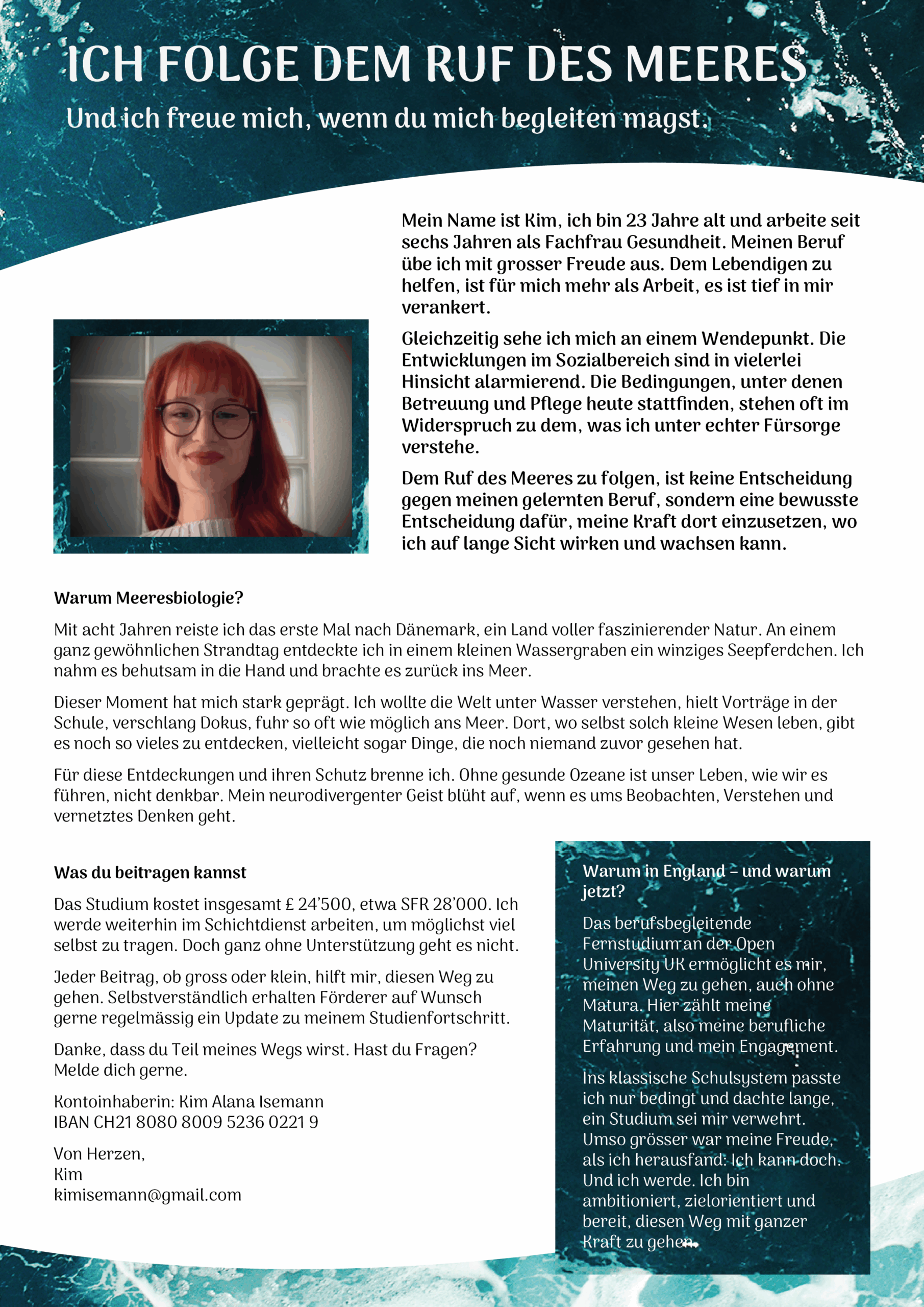 Im kommenden Frühjahr beginnt Kim ihr Meeresbiologie-Studium an der Open University UK, ein berufsbegleitender Studiengang, der Menschen wie ihr den Weg öffnet, auch ohne klassische Bildungsbiografie. Kim nennt es ihre „Maturität“, weil hier zählt, was sie gelebt, gelernt und geleistet hat.